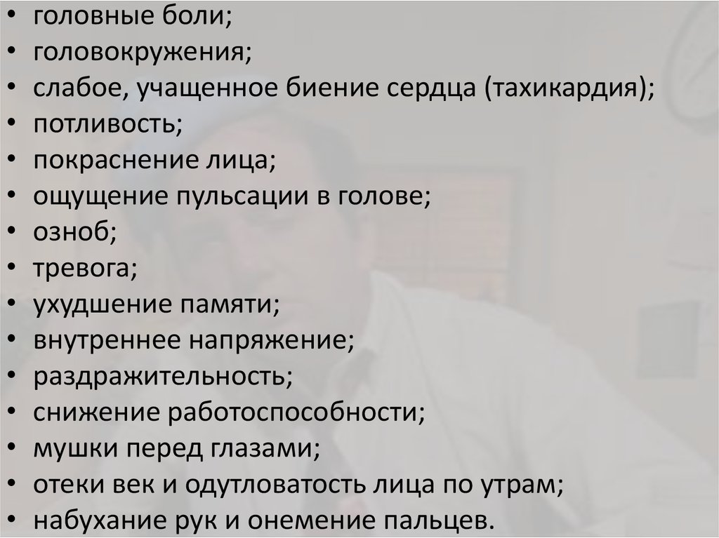 • Неприятные ощущения, связанные сповышением кровяного давления, — шум в