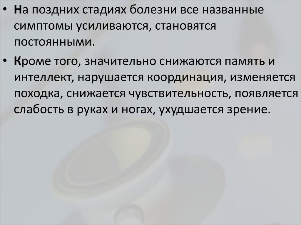 • На поздних стадиях болезни все названныесимптомы усиливаются, становятся