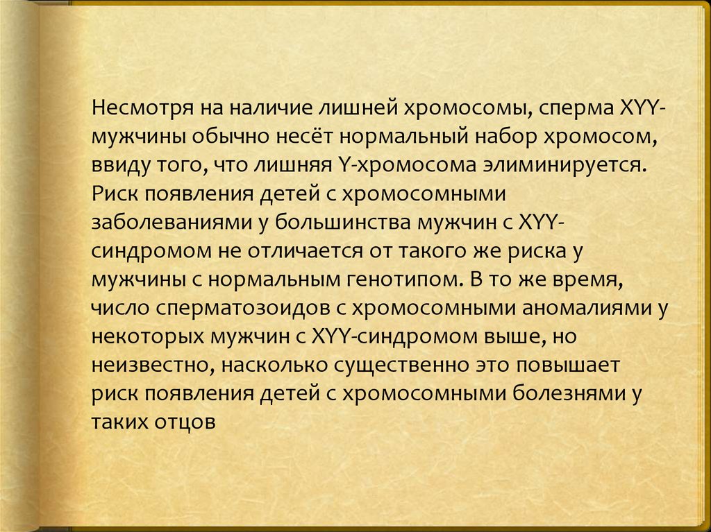 Несмотря на наличие лишней хромосомы, сперма XYYмужчины обычно несёт нормальный набор хромосом,ввиду того, что лишняя Y-хромосома элиминируется.