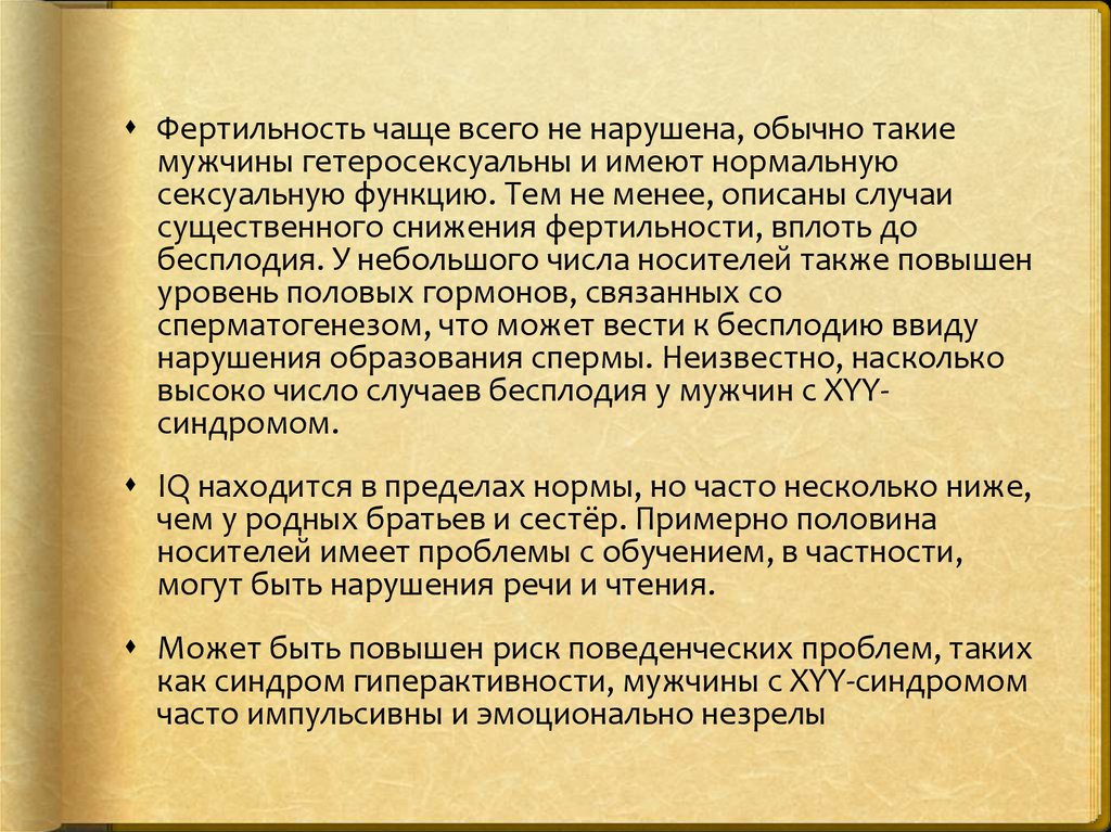 заболеваниями у большинства мужчин с XYYсиндромом не отличается от такого же риска у