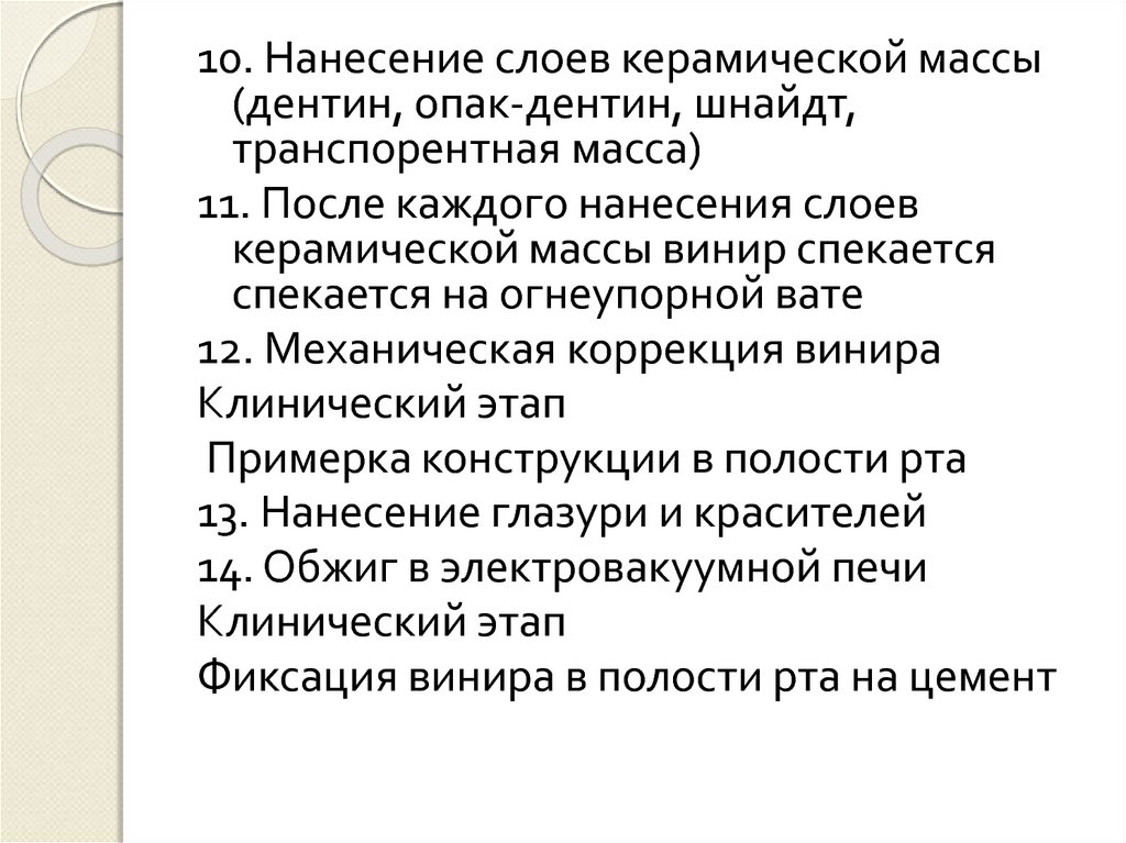 10. Нанесение слоев керамической массы(дентин, опак-дентин, шнайдт,