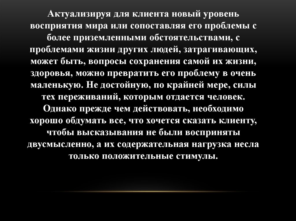 Актуализируя для клиента новый уровеньвосприятия мира или сопоставляя его проблемы с