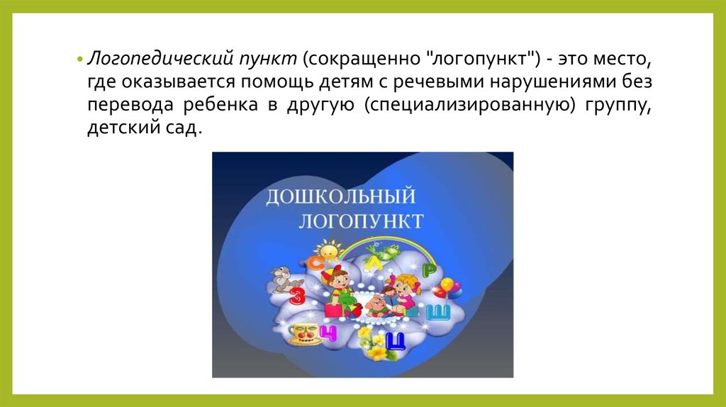 • Логопедический пункт (сокращенно "логопункт") - это место,где оказывается помощь детям с речевыми нарушениями без
