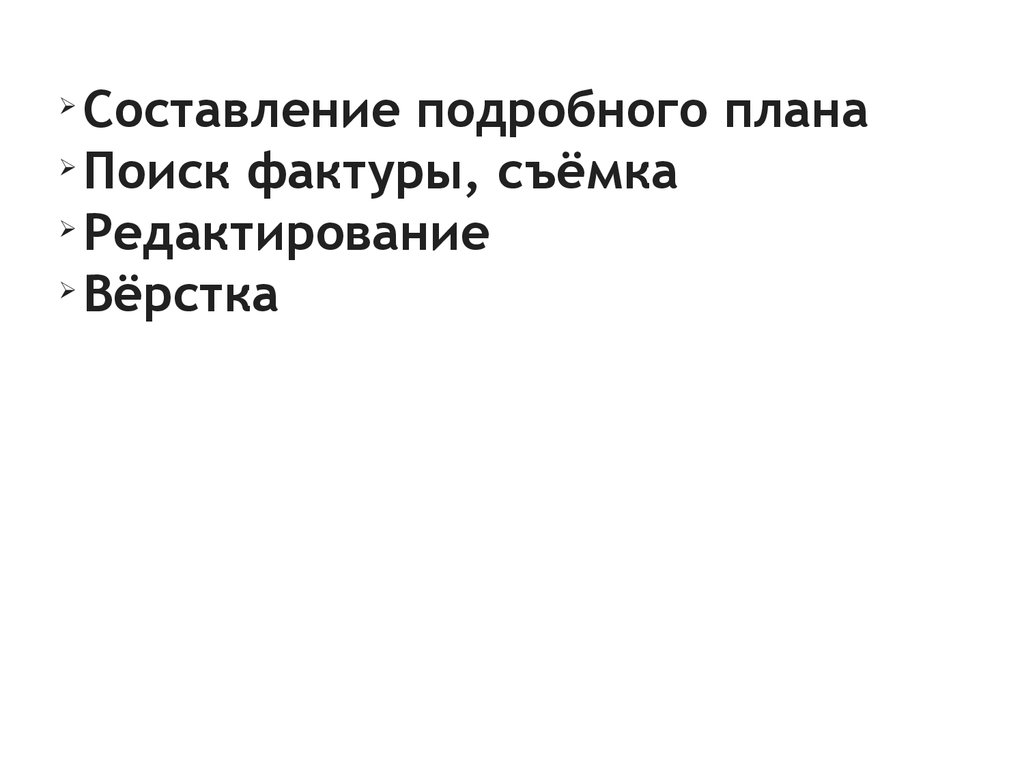 Составление подробного планаПоиск фактуры, съёмка