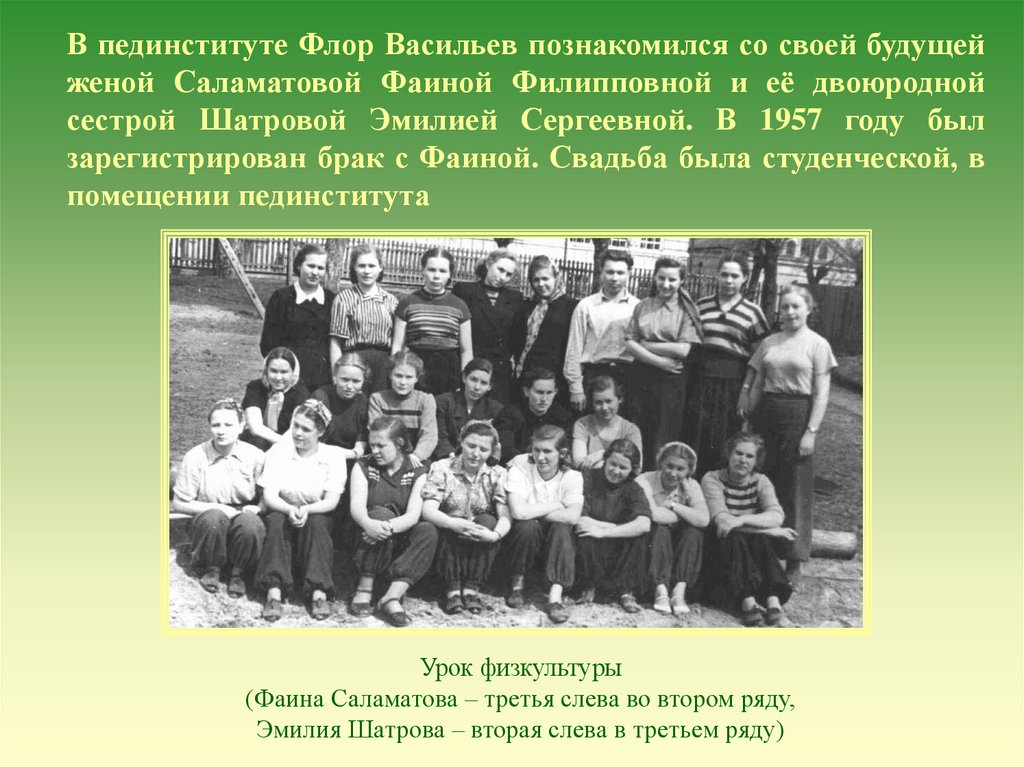 В пединституте Флор Васильев познакомился со своей будущейженой Саламатовой Фаиной Филипповной и её двоюродной