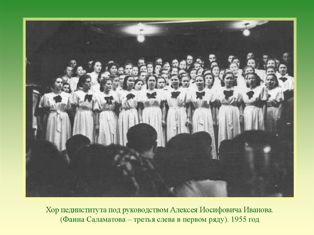 Хор пединститута под руководством Алексея Иосифовича Иванова.(Фаина Саламатова – третья слева в первом ряду). 1955 год