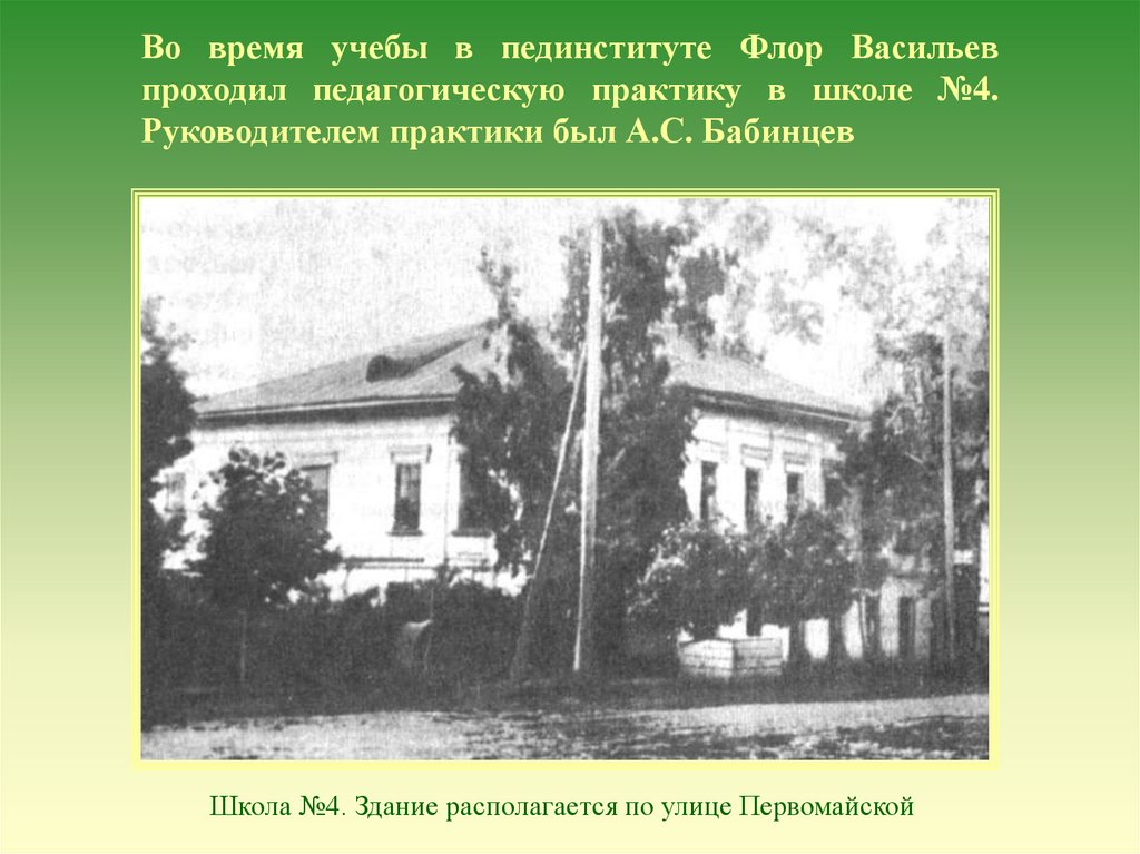 Во время учебы в пединституте Флор Васильевпроходил педагогическую практику в школе №4.