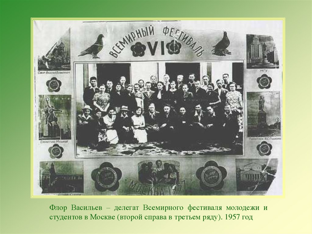 Флор Васильев – делегат Всемирного фестиваля молодежи истудентов в Москве (второй справа в третьем ряду). 1957 год