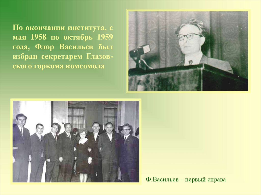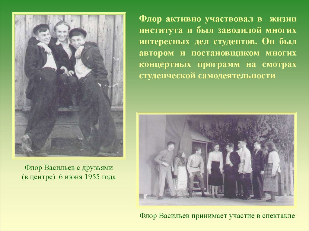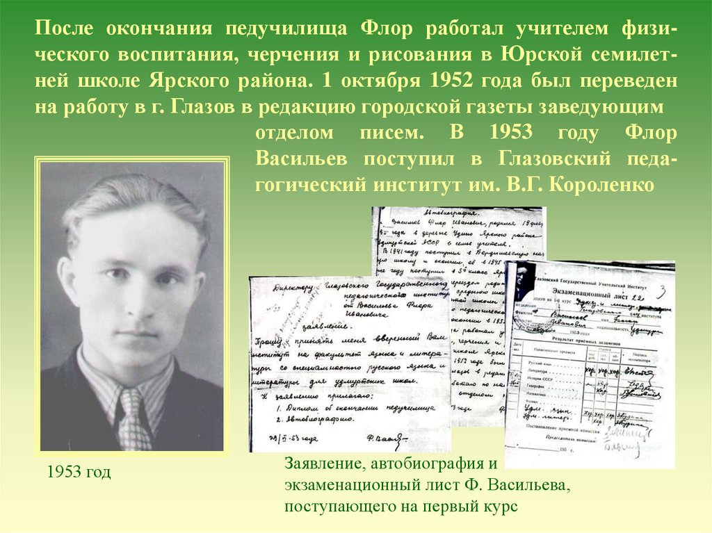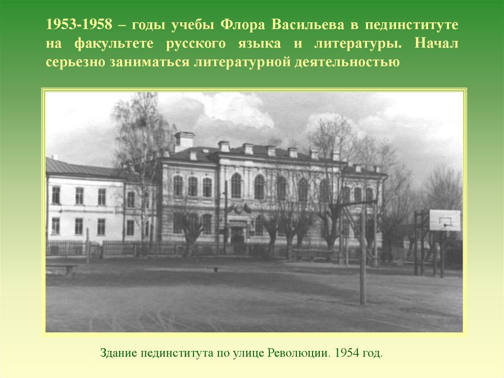 1953-1958 – годы учебы Флора Васильева в пединститутена факультете русского языка и литературы. Начал