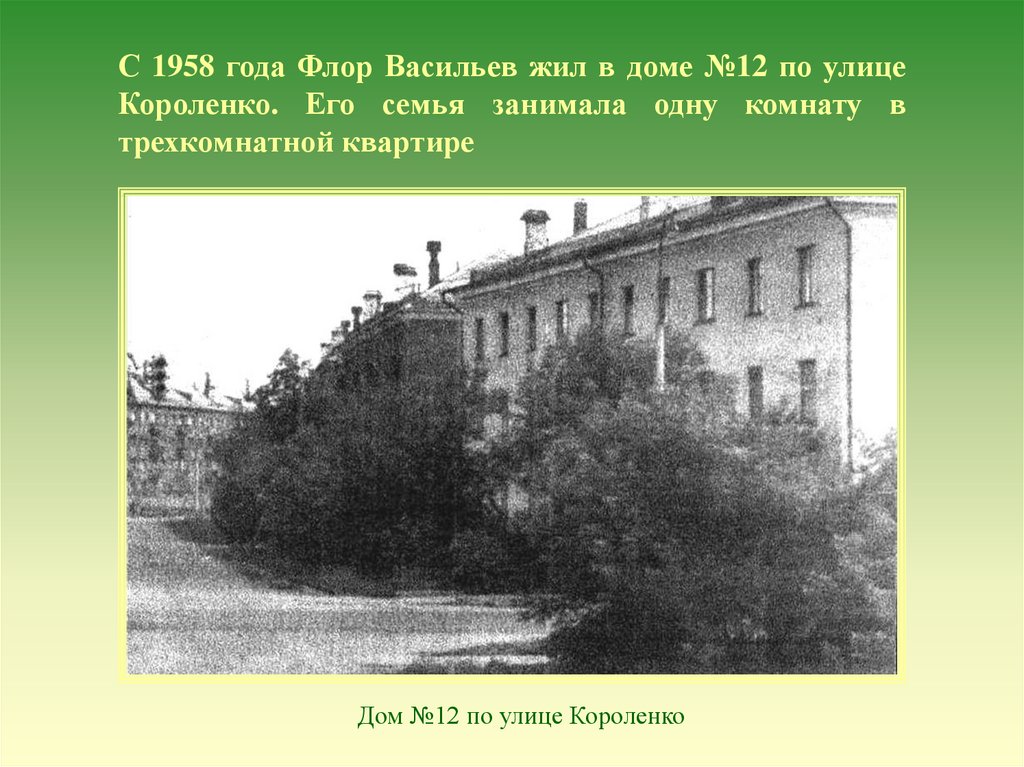 С 1958 года Флор Васильев жил в доме №12 по улицеКороленко. Его семья занимала одну комнату в