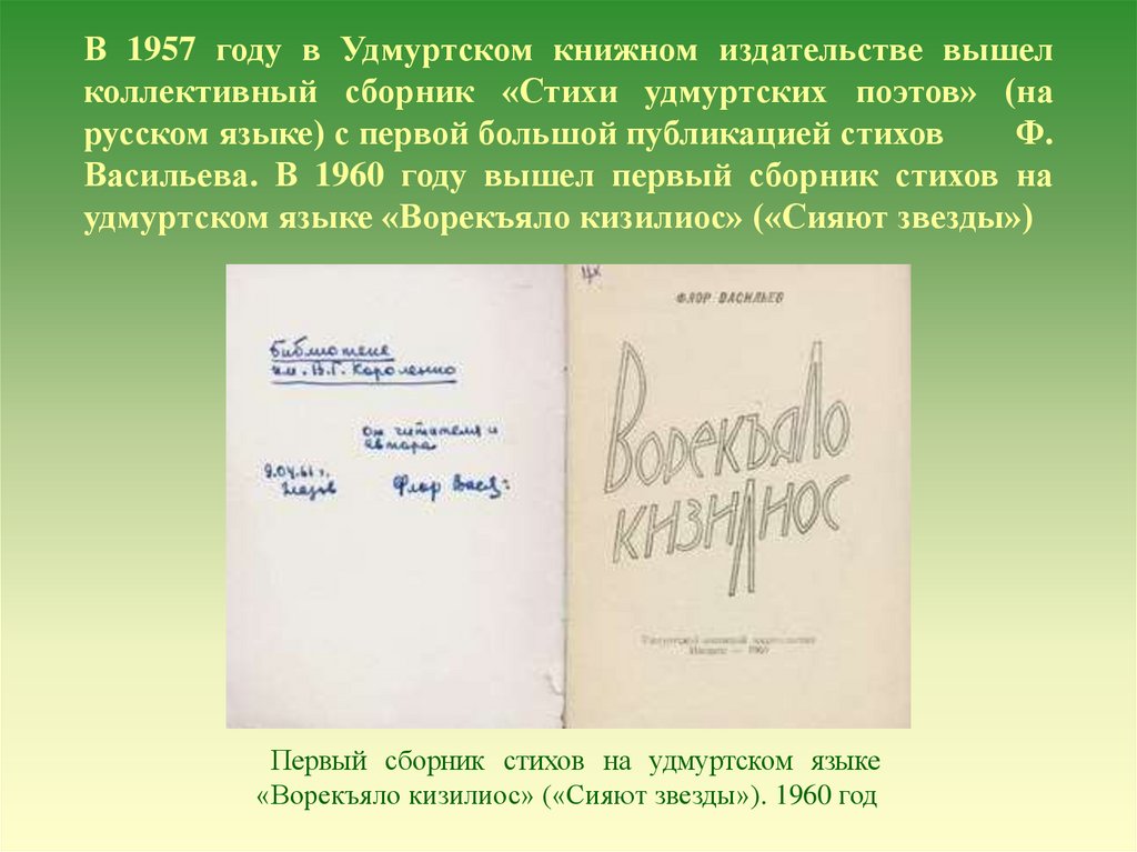 В 1957 году в Удмуртском книжном издательстве вышелколлективный сборник «Стихи удмуртских поэтов» (на