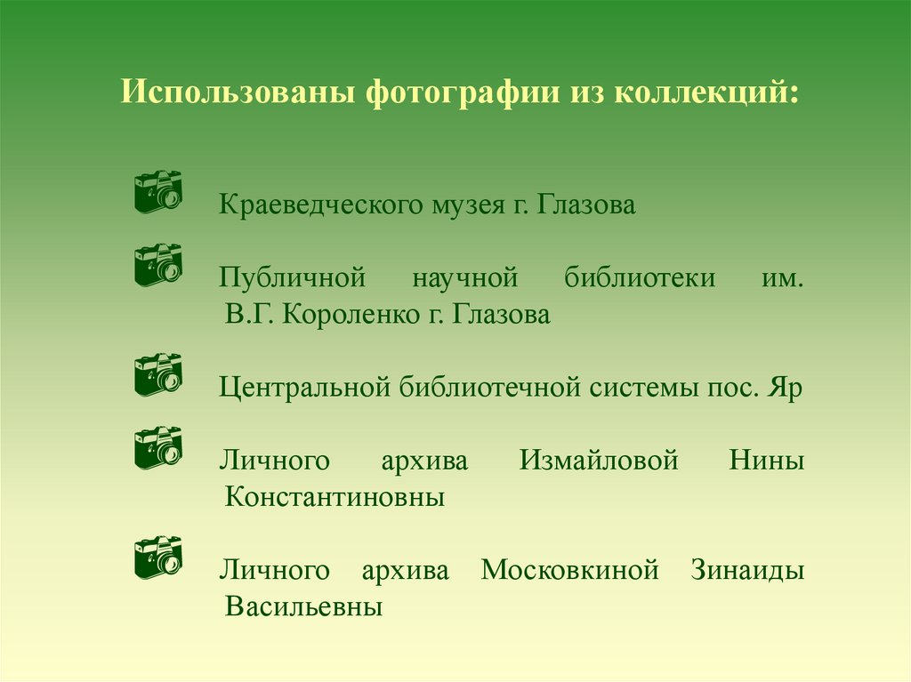 Использованы фотографии из коллекций:Центральной библиотечной системы пос. Яр