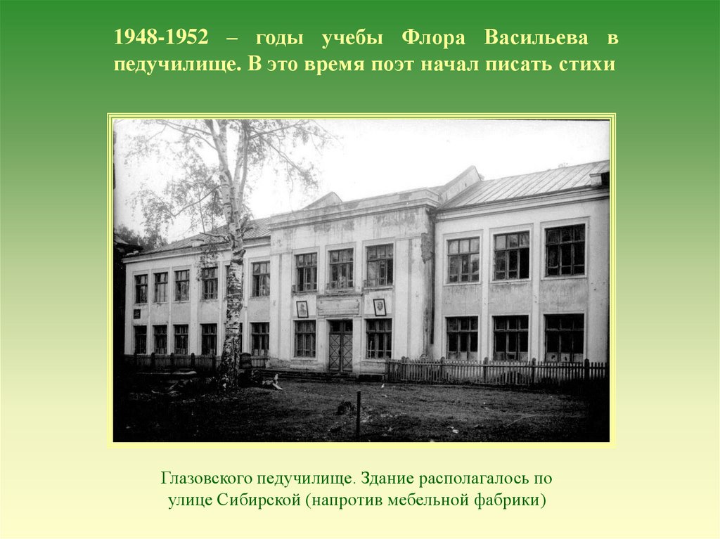 1948-1952 – годы учебы Флора Васильева впедучилище. В это время поэт начал писать стихи
