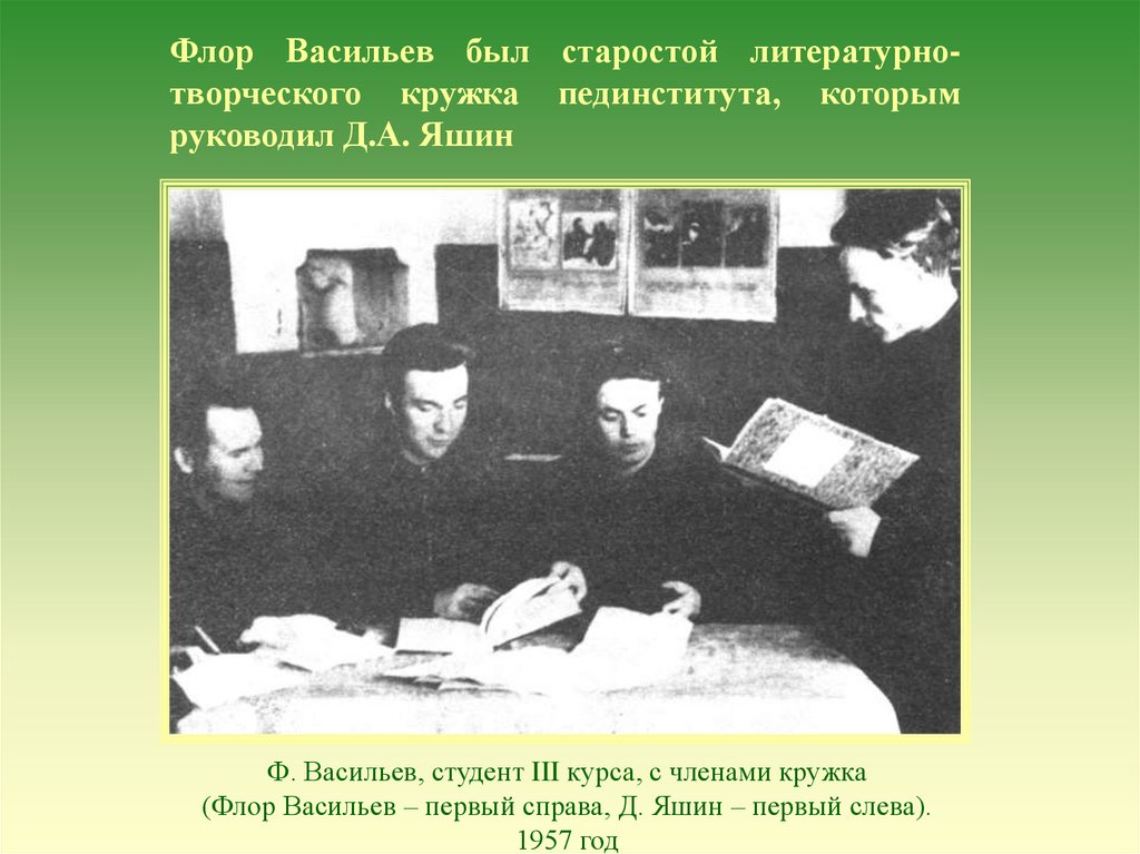 Флор Васильев был старостой литературнотворческого кружка пединститута, которымруководил Д.А. Яшин