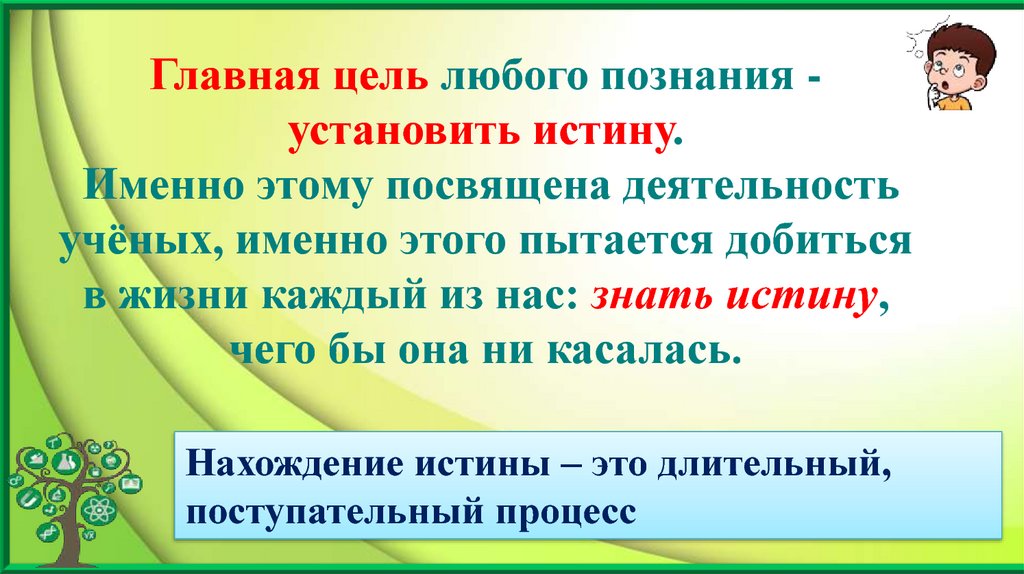 Главная цель любого познания установить истину.Именно этому посвящена деятельность