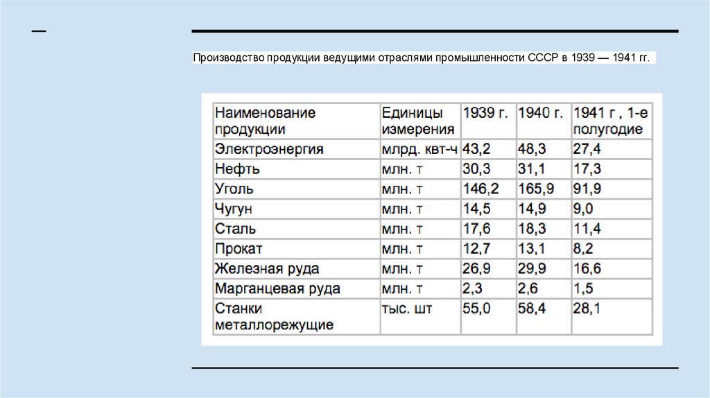 Производство продукции ведущими отраслями промышленности СССР в 1939 — 1941 гг.3.