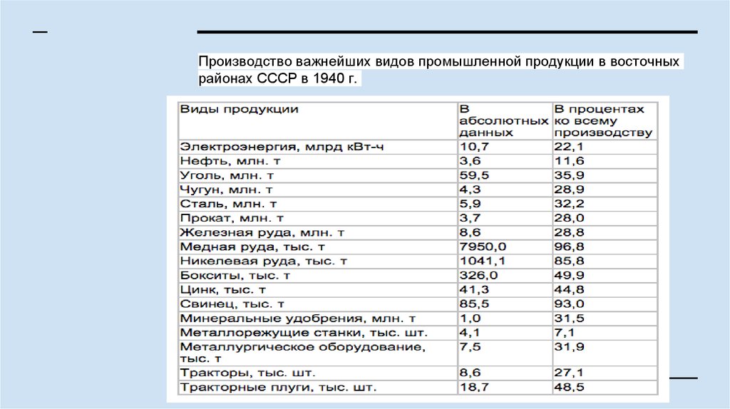 Производство важнейших видов промышленной продукции в восточныхрайонах СССР в 1940 г.