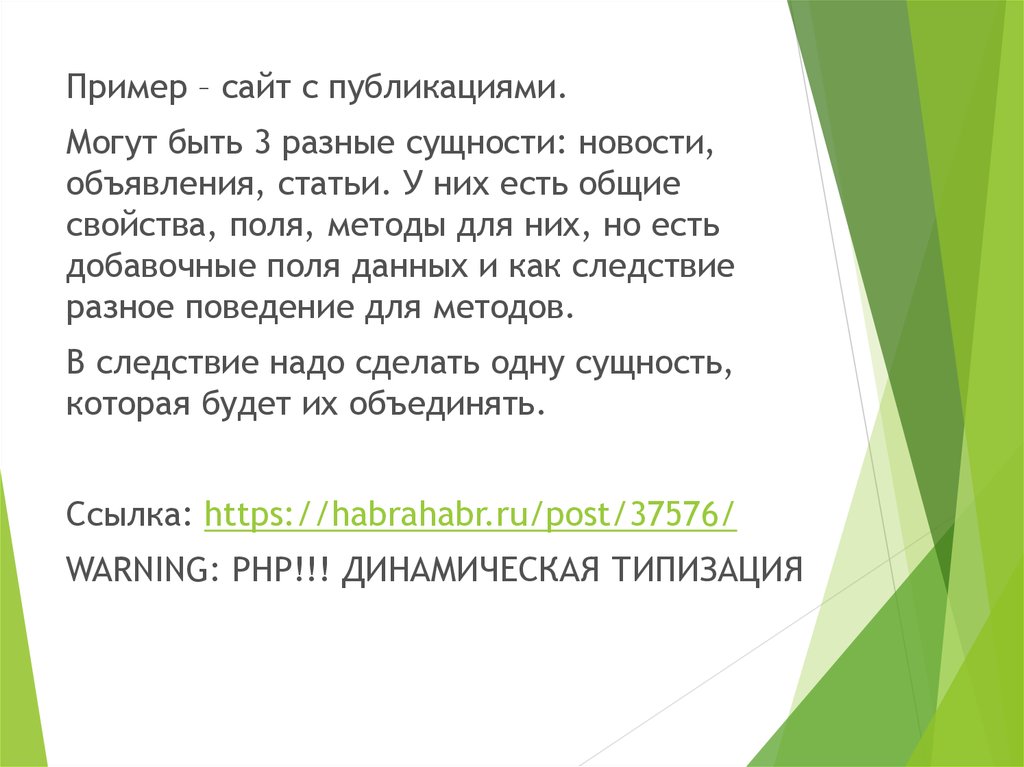 Пример – сайт с публикациями.Могут быть 3 разные сущности: новости,