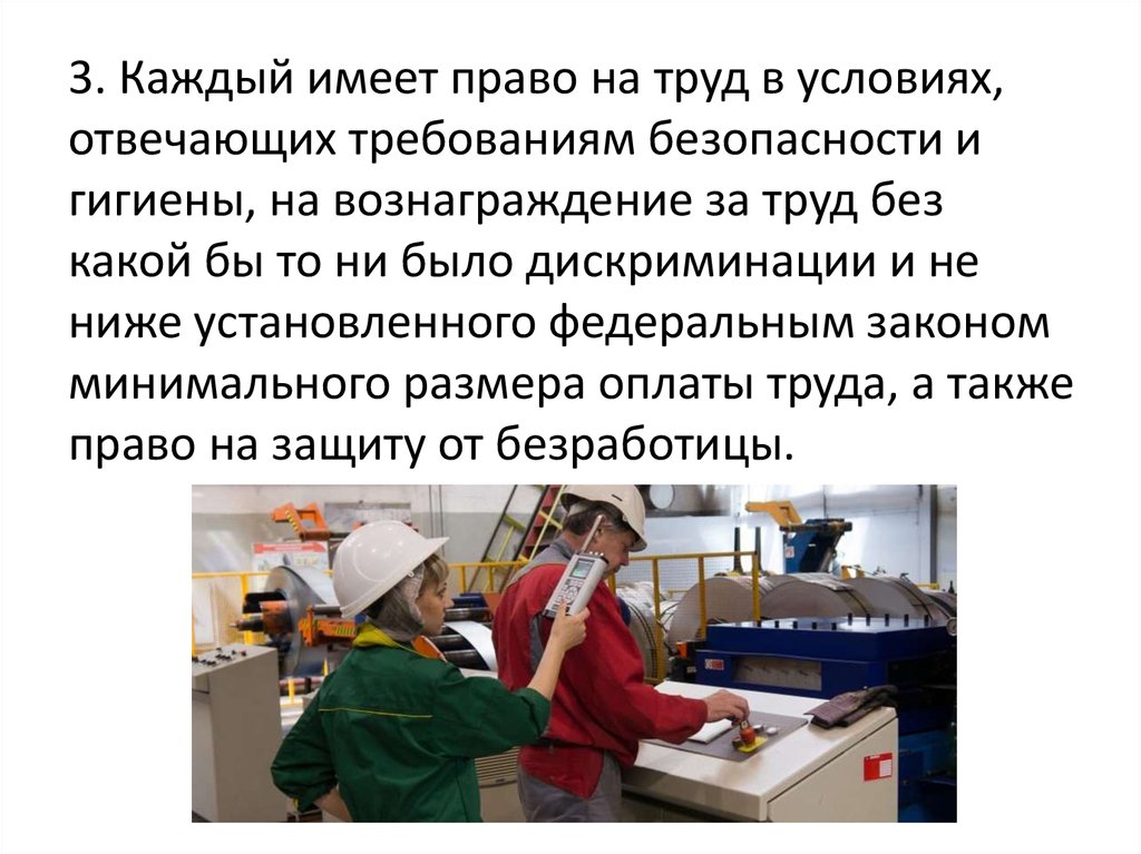 3. Каждый имеет право на труд в условиях,отвечающих требованиям безопасности и