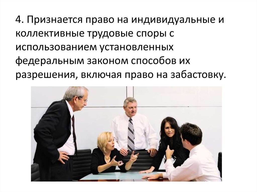 4. Признается право на индивидуальные иколлективные трудовые споры с