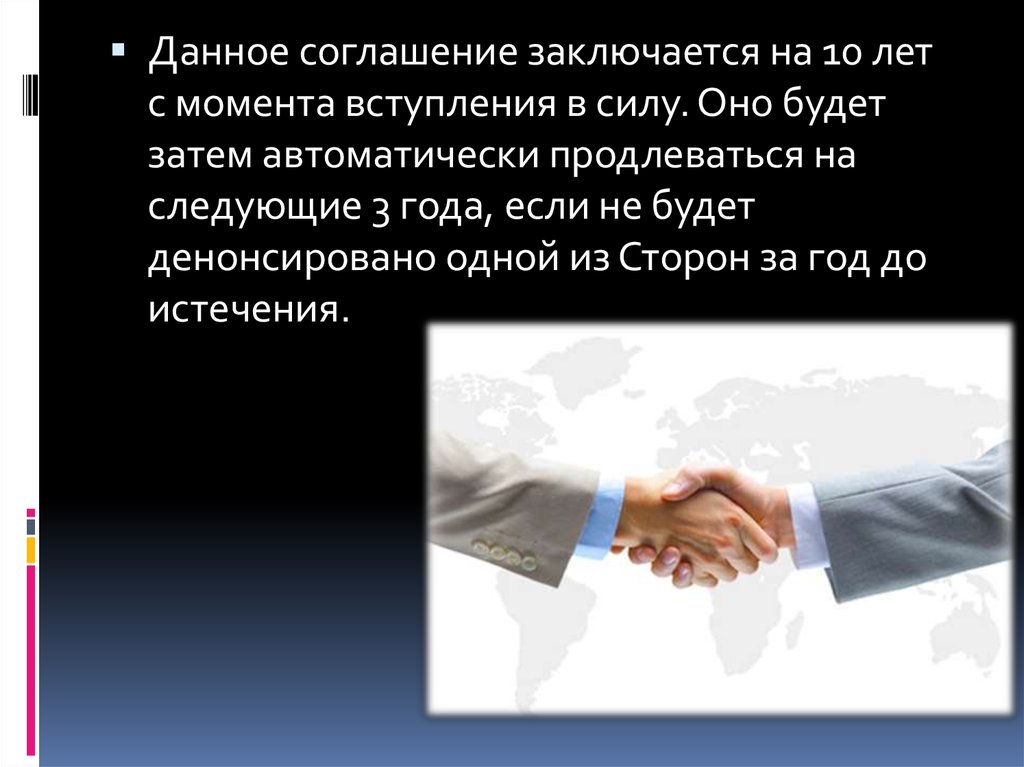 Данное соглашение заключается на 10 летс момента вступления в силу. Оно будет