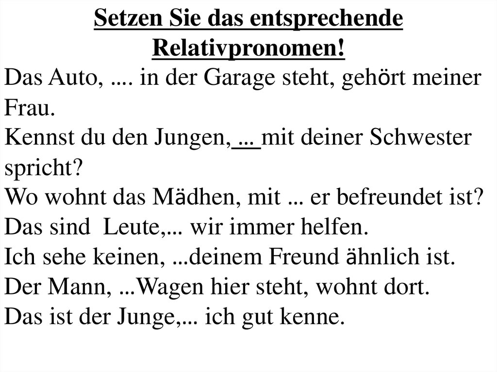Setzen Sie das entsprechende Relativpronomen ein!Ich besuche oft meinen Onkel, … nicht weit von uns