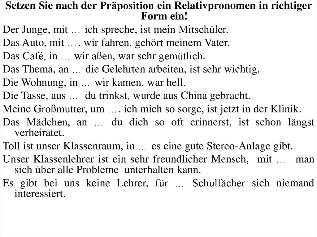 Setzen Sie nach der Präposition ein Relativpronomen in richtigerForm ein!