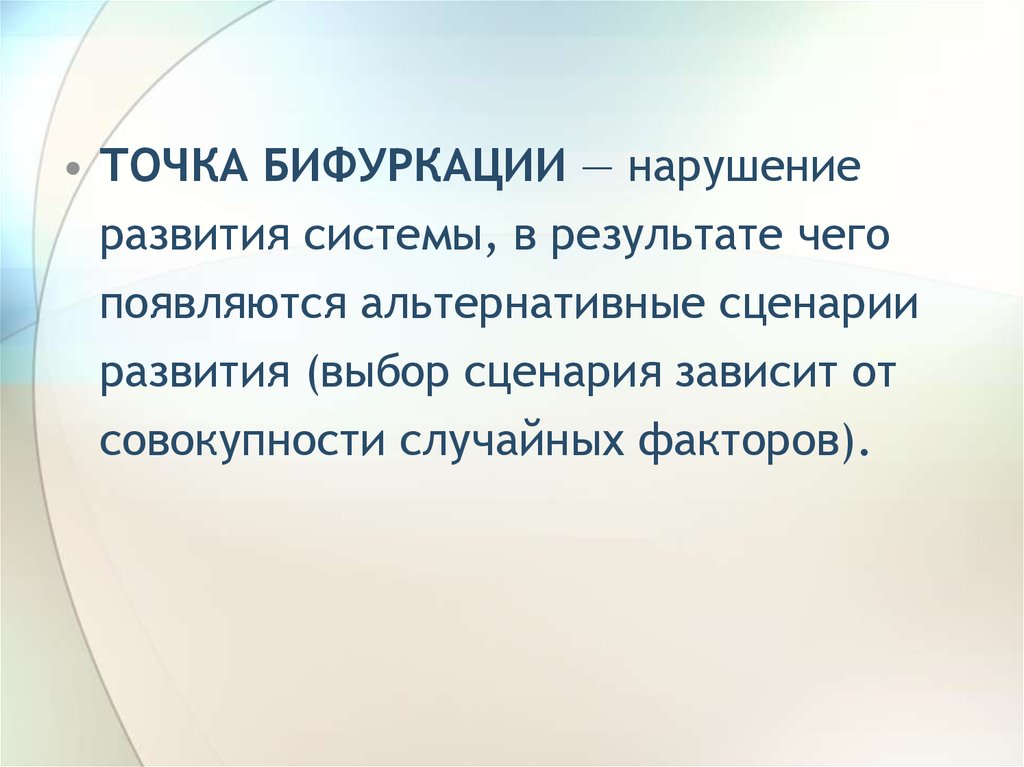 • ТОЧКА БИФУРКАЦИИ — нарушениеразвития системы, в результате чего