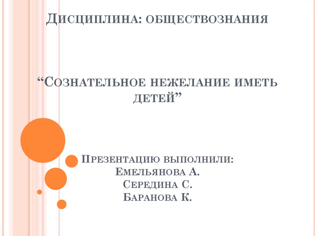 1. Дисциплина: общеcтвознания “Сознательное нежелание иметь детей” Презентацию выполнили: Емельянова А. Середина С. Баранова К.