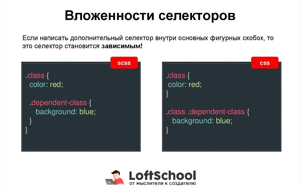 Вложенности селекторовЕсли написать дополнительный селектор внутри основных фигурных скобок, то