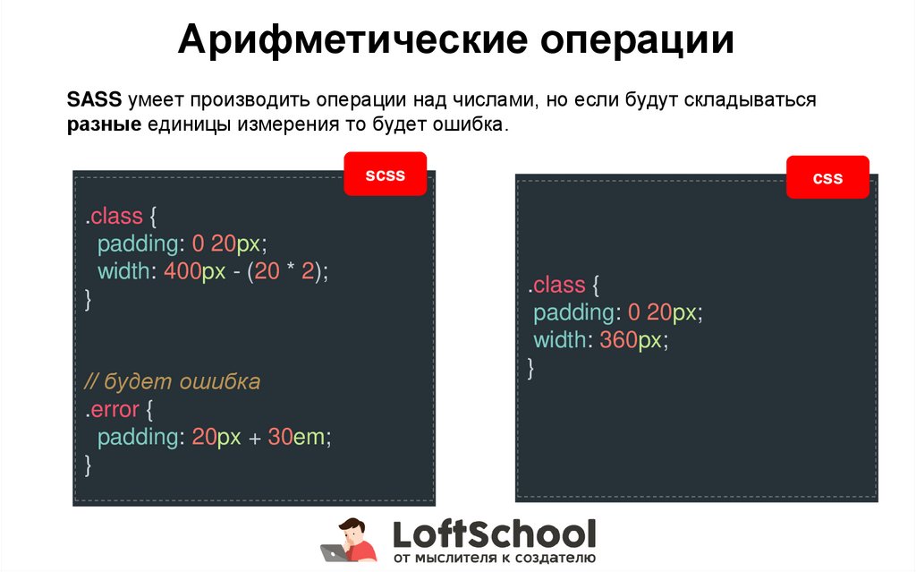 Арифметические операцииSASS умеет производить операции над числами, но если будут складываться