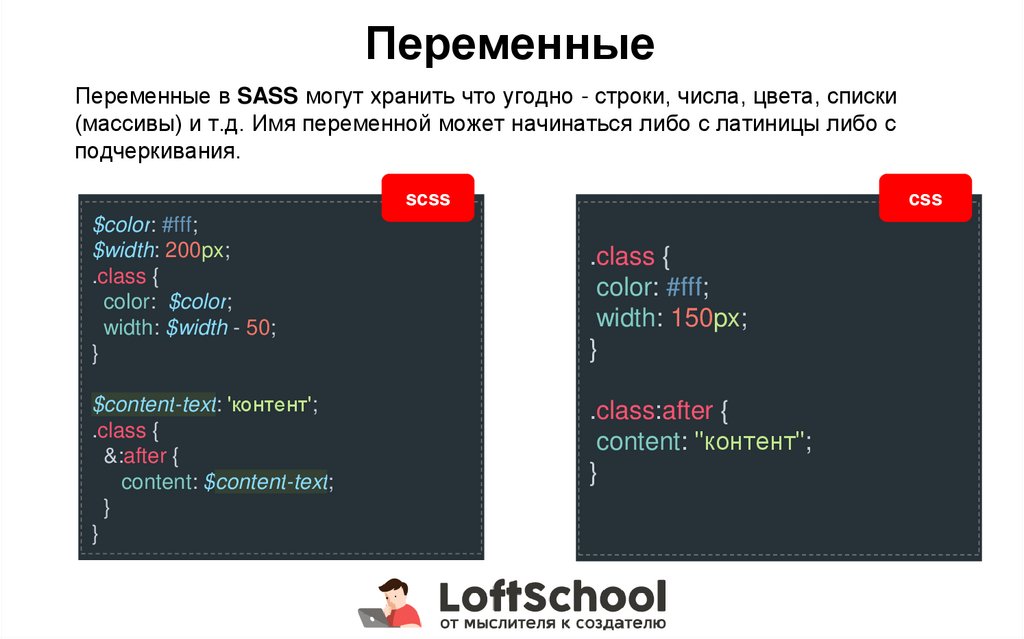 ПеременныеПеременные в SASS могут хранить что угодно - строки, числа, цвета, списки