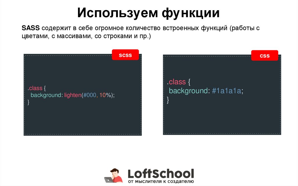 Используем функцииSASS содержит в себе огромное количество встроенных функций (работы с
