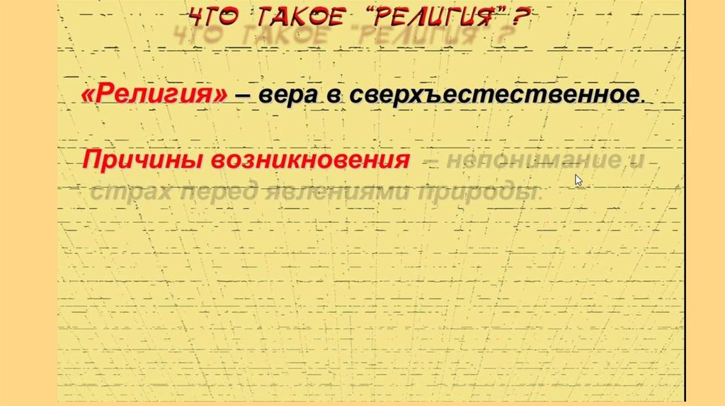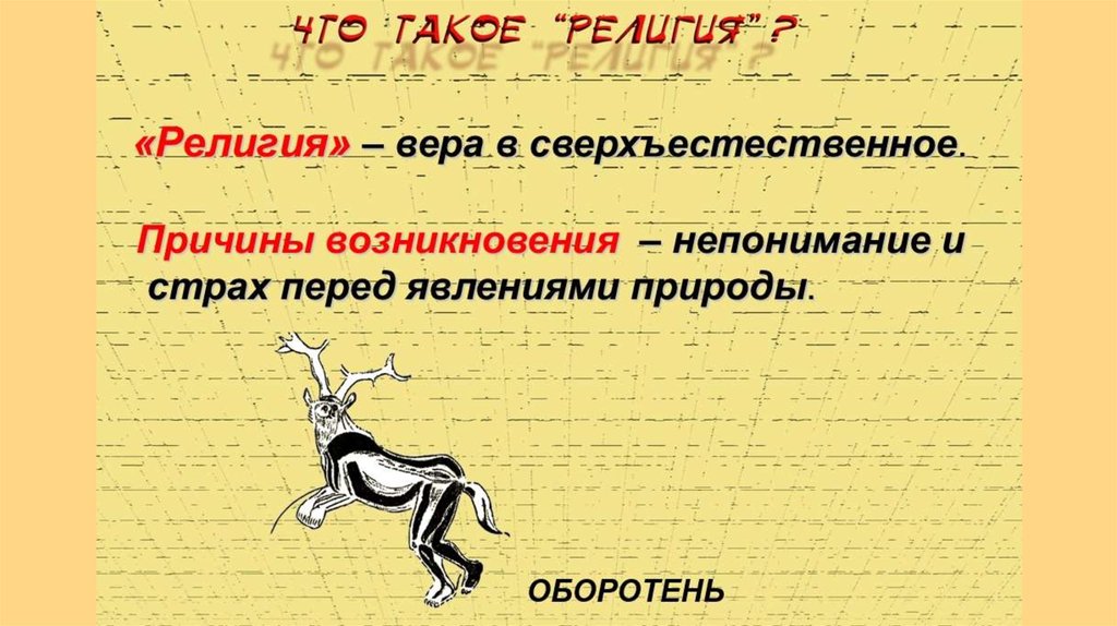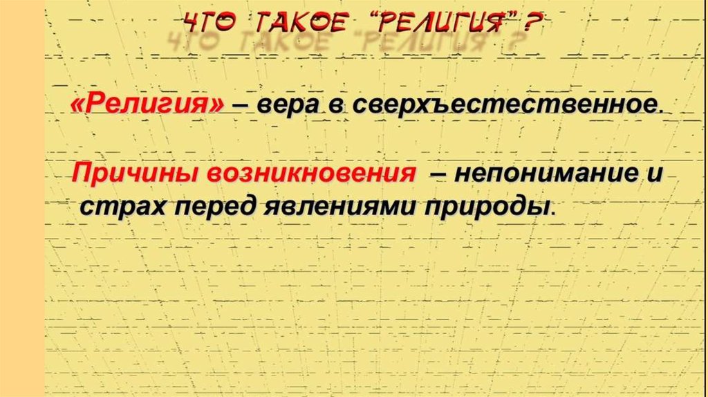 Религия – вера в вымышленные сверхъестественные существа- богов, духов, души – и поклонение им.