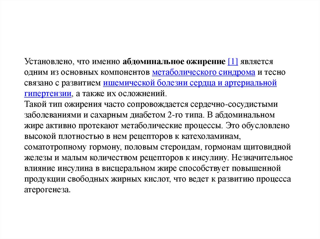 Установлено, что именно абдоминальное ожирение [1] являетсяодним из основных компонентов метаболического синдрома и тесно