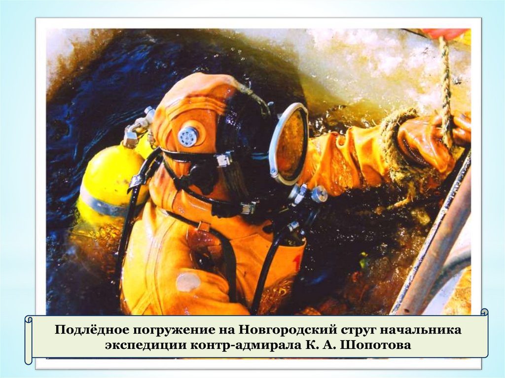 Подлёдное погружение на Новгородский струг начальникаэкспедиции контр-адмирала К. А. Шопотова