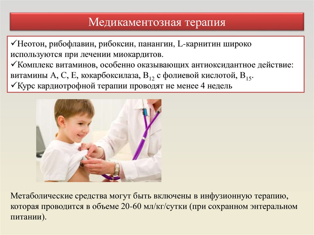 Медикаментозная терапияНеотон, рибофлавин, рибоксин, панангин, L-карнитин широко