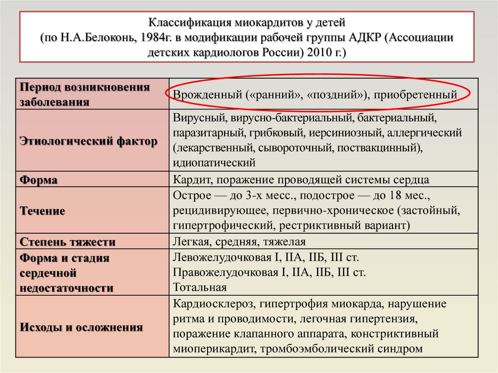 Классификация миокардитов у детей(по Н.А.Белоконь, 1984г. в модификации рабочей группы АДКР (Ассоциации