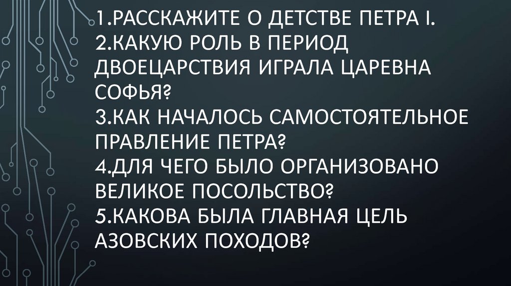 1. 1.Расскажите о детстве Петра I. 2.Какую роль в период двоецарствия играла царевна Софья? 3.Как началось самостоятельное