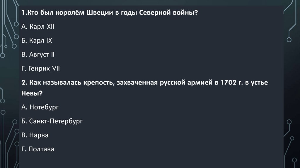 1.Кто был королём Швеции в годы Северной войны?А. Карл XII