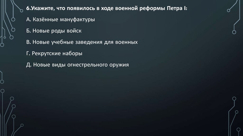 6.Укажите, что появилось в ходе военной реформы Петра I:А. Казённые мануфактуры