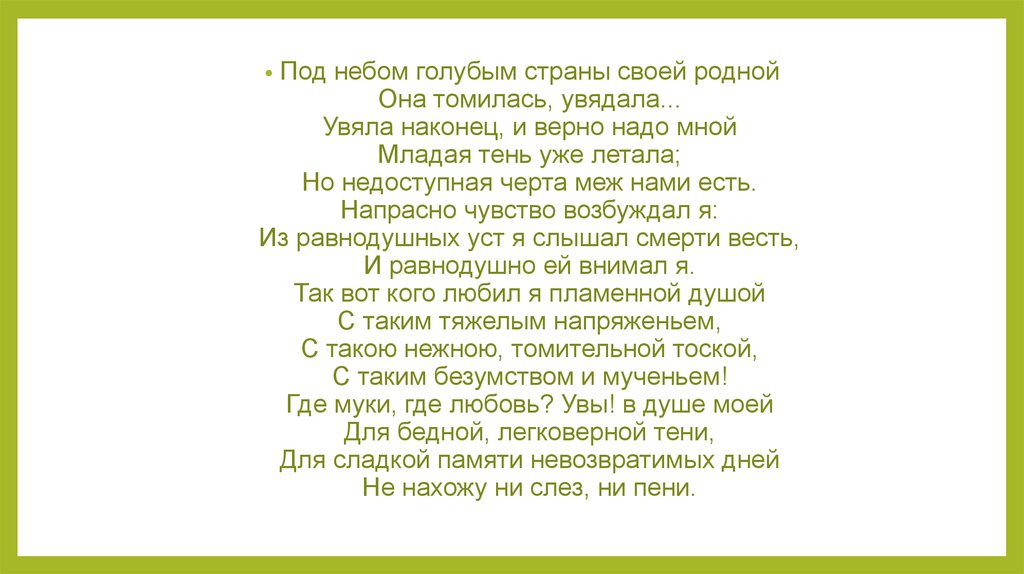 Под небом голубым страны своей роднойОна томилась, увядала...