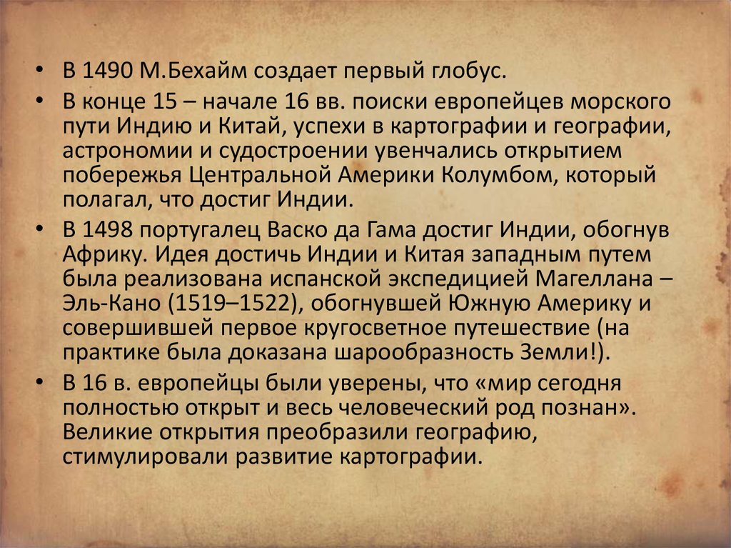 • В 1490 М.Бехайм создает первый глобус.• В конце 15 – начале 16 вв. поиски европейцев морского