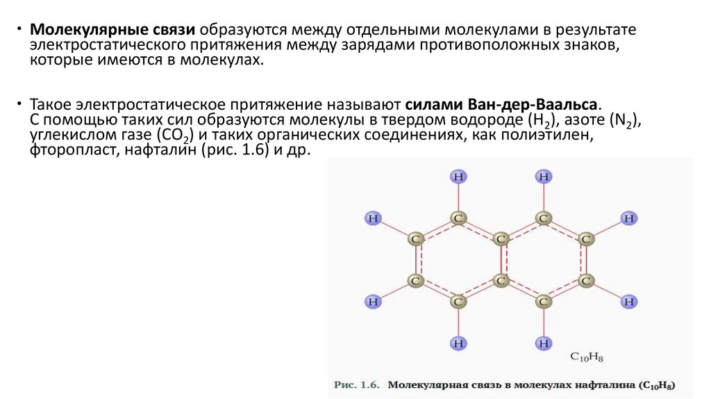 Молекулярные связи образуются между отдельными молекулами в результатеэлектростатического притяжения между зарядами противоположных знаков,