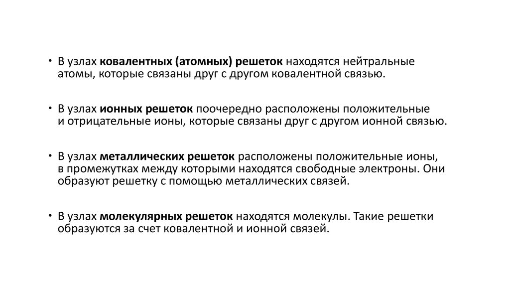 В узлах ковалентных (атомных) решеток находятся нейтральныеатомы, которые связаны друг с другом ковалентной связью.