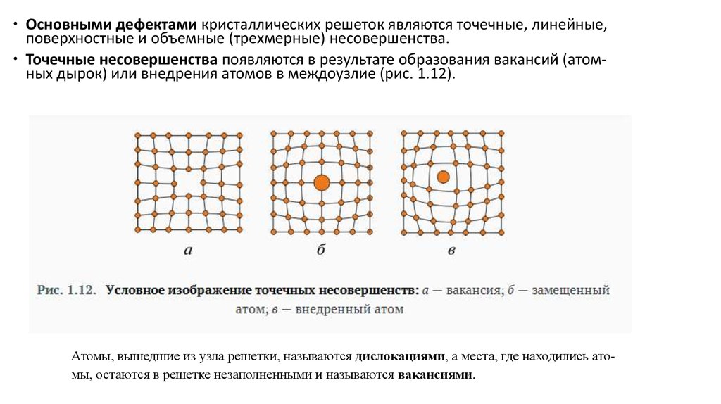 Атомы, вышедшие из узла решетки, называются дислокациями, а места, где находились атомы, остаются в решетке незаполненными и называются вакансиями.