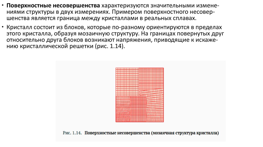 Поверхностные несовершенства характеризуются значительными изменениями структуры в двух измерениях. Примером поверхностного несовершенства является граница между кристаллами в реальных сплавах.Кристалл состоит из блоков, которые по-разному ориентируются в пределах