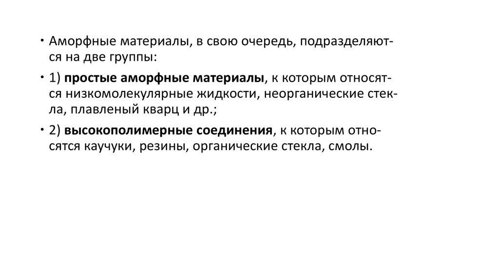 Аморфные материалы, в свою очередь, подразделяются на две группы:1) простые аморфные материалы, к которым относятся низкомолекулярные жидкости, неорганические стекла, плавленый кварц и др.;