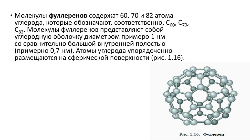 Молекулы фуллеренов содержат 60, 70 и 82 атомауглерода, которые обозначают, соответственно, С60, С70,
