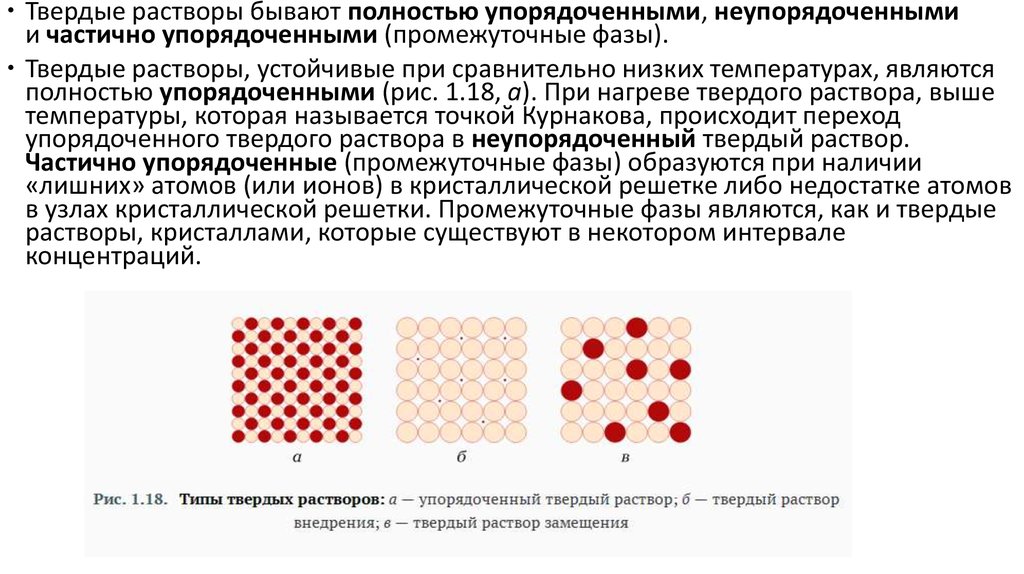 Твердые растворы бывают полностью упорядоченными, неупорядоченнымии частично упорядоченными (промежуточные фазы).